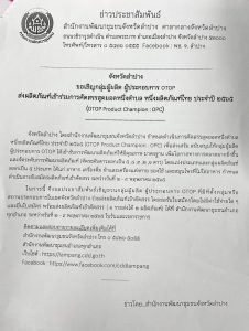 ขอเชิญกลุ่มผู้ผลิต ผู้ประกอบการ OTOP ส่งผลิตภัณฑ์เข้าร่วมการคัดสรรสุดยอดหนึ่งตำบล หนึ่งผลิตภัณฑ์ไทย ประจำปี 2565 Share FacebookTwitterGoogle+ReddItWhatsAppPinterestEmail