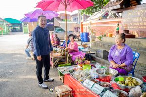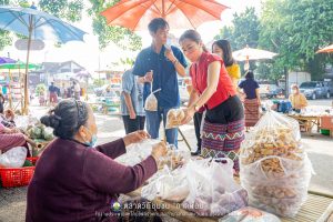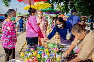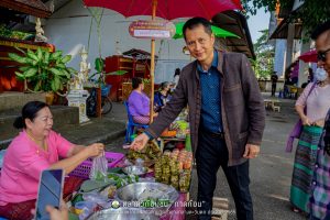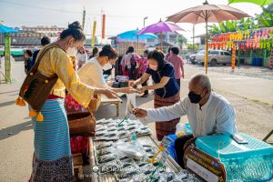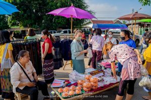 บรรยากาศภาคเช้า ตลาดวิถีชุมชน “กาดก้อม” ในงานประเพณีแห่โคมไฟครัวตานวัดลำปางกลางตะวันตก ประจำปี 2565