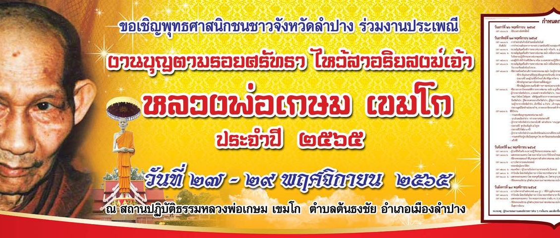 ททท.สำนักงานลำปาง ขอเชิญร่วมงานประเพณี ‘งานบุญตามรอยศรัทธา ไหว้สาอริยสงฆ์เจ้า หลวงพ่อเกษม เขมโก ประจำปี 2565’ ระหว่างวันที่ 27-29 พฤศจิกายน 2565 จัดโดย อำเภอเมืองลำปาง ร่วมกับมูลนิธิไตรลักษณ์เขมกะภิกขุ และองค์กรปกครองส่วนท้องถิ่น ณ สถานปฏิบัติธรรมหลวงพ่อเกษม เขมโก อ.เมือง จ.ลำปาง