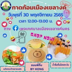 วันพุธที่ 30 พฤศจิกายน 2565 เวลา 12.00 น. เทศบาลเมืองเขลางค์นคร จัดกิจกรรมการส่งเสริมช่องทางการจำหน่ายสินค้าแก่กลุ่มอาชีพและผู้ประกอบการในเขตเทศบาลเมืองเขลางค์นคร โดยเป็นการจำหน่ายสินค้าออนไลน์ผ่านทางเพจเทศบาลเมืองเขลางค์นคร (กาดก้อมเมืองเขลางค์) อาทิเช่น