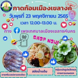 วันพุธที่ 23 พฤศจิกายน 2565 เวลา 12.00 น. เทศบาลเมืองเขลางค์นคร จัดกิจกรรมการส่งเสริมช่องทางการจำหน่ายสินค้าแก่กลุ่มอาชีพและผู้ประกอบการในเขตเทศบาลเมืองเขลางค์นคร โดยเป็นการจำหน่ายสินค้าออนไลน์ผ่านทางเพจเทศบาลเมืองเขลางค์นคร (กาดก้อมเมืองเขลางค์) อาทิเช่น