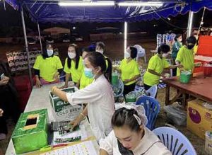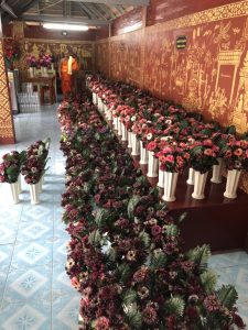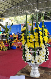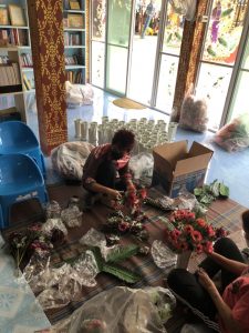 – กลุ่มสตรีจัดเตรียมแจกันดอกไม้เพื่อมอบให้กับวัดต่าง ๆ ที่มาร่วมทำบุญสร้างกำแพงวัด