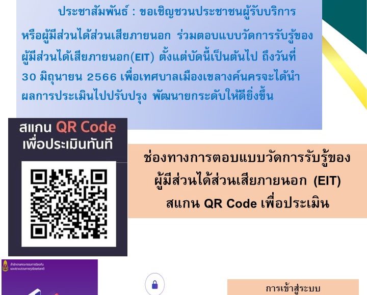 👉👉 ขอเชิญชวนประชาชนผู้รับบริการ หรือผู้มีส่วนได้ส่วนเสียภายนอก ร่วมตอบแบบวัดการรับรู้ของผู้มีส่วนได้ส่วนเสีย ภายนอก (EIT) ประจำปี 2566 ตั้งแต่บัดนี้ถึงวันที่ 30 มิถุนายน 2566 เพื่อที่ทางเทศบาลเมืองเขลางค์นครจะได้นำผลการประเมินไปปรับปรุง พัฒนายกระดับให้ดียิ่งขึ้นไป >>>สแกน Qr Code เพื่อทำการประเมิน<<< หรือคลิ๊กที่ลิงค์👉👉👉 https://itas.nacc.go.th/go/eit/yk0h1c 🙏🙏🙏