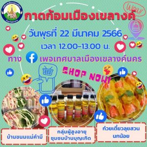 วันพุธที่ 22 มีนาคม 2566 เวลา 12.00 น. เทศบาลเมืองเขลางค์นคร จัดกิจกรรมการส่งเสริมช่องทางการจำหน่ายสินค้าแก่กลุ่มอาชีพและผู้ประกอบการในเขตเทศบาลเมืองเขลางค์นคร โดยเป็นการจำหน่ายสินค้าออนไลน์ผ่านทางเพจเทศบาลเมืองเขลางค์นคร (กาดก้อมเมืองเขลางค์) อาทิเช่น