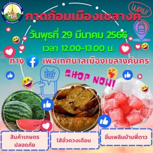 วันพุธที่ 29 มีนาคม 2566 เวลา 12.00 น. เทศบาลเมืองเขลางค์นคร จัดกิจกรรมการส่งเสริมช่องทางการจำหน่ายสินค้าแก่กลุ่มอาชีพและผู้ประกอบการในเขตเทศบาลเมืองเขลางค์นคร โดยเป็นการจำหน่ายสินค้าออนไลน์ผ่านทางเพจเทศบาลเมืองเขลางค์นคร (กาดก้อมเมืองเขลางค์) อาทิเช่น