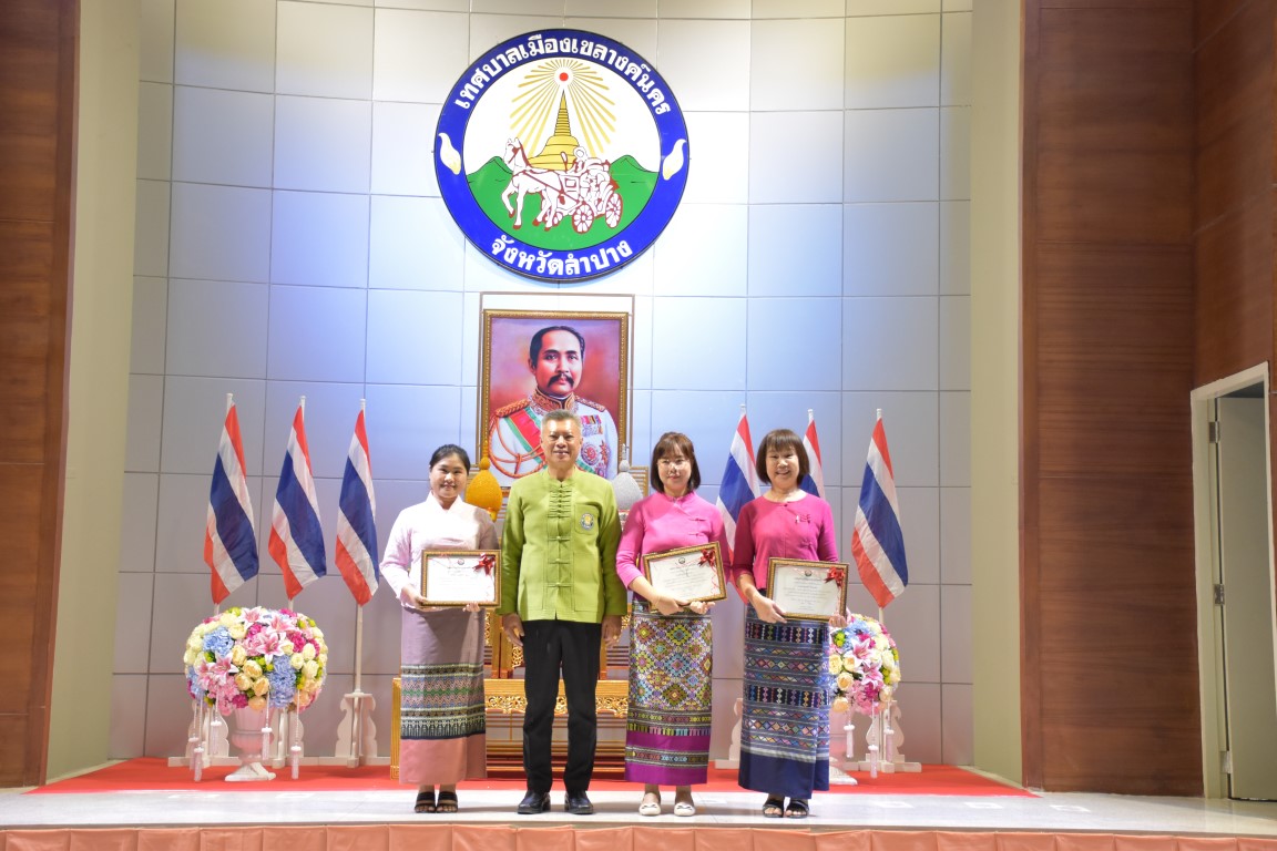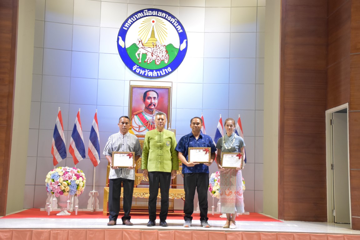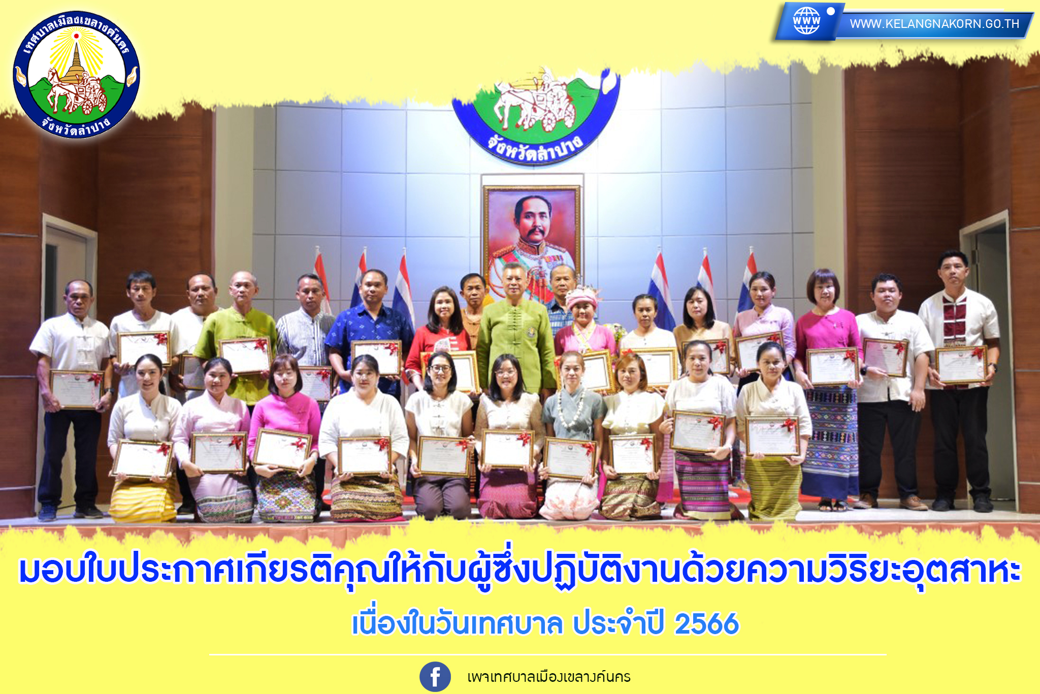 วันที่ 24 เมษายน 2566 เวลา 10.30 น. นายไพฑูรย์ โพธิ์ทอง นายกเทศมนตรีเมืองเขลางค์นคร มอบใบประกาศเกียรติคุณให้กับผู้ซึ่งปฏิบัติงานด้วยความวิริยะอุตสาหะจนเกิดผลดีแก่ทางราชการให้แก่พนักงานเทศบาล ลูกจ้างประจำ พนักงานจ้างตามภารกิจ และพนักงานจ้างทั่วไปดีเด่นระดับกอง และระดับเทศบาล ตามโครงการการจัดงานวันเทศบาล ประจำปี 2566 เพื่อเชิดชูเกียรติและเป็นขวัญกำลังใจให้กับพนักงานเจ้าหน้าที่ ณ ห้องประชุมชมพู ชั้น 1