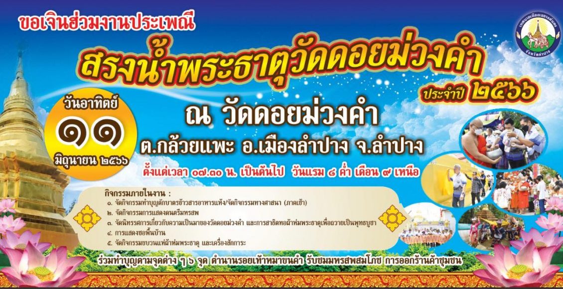 การจัดกิจกรรมในปีนี้จัดอย่างยิ่งใหญ่เช่นเคย จึงขอเชิญทุกท่านร่วมงานประเพณีสรงน้ำพระธาตุดอยม่วงคำเพื่อความเป็นสิริมงคล ณ วัดดอยม่วงคำ ตำบลกล้วยแพะ ในเขตเทศบาลเมืองเขลางค์นคร