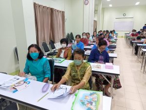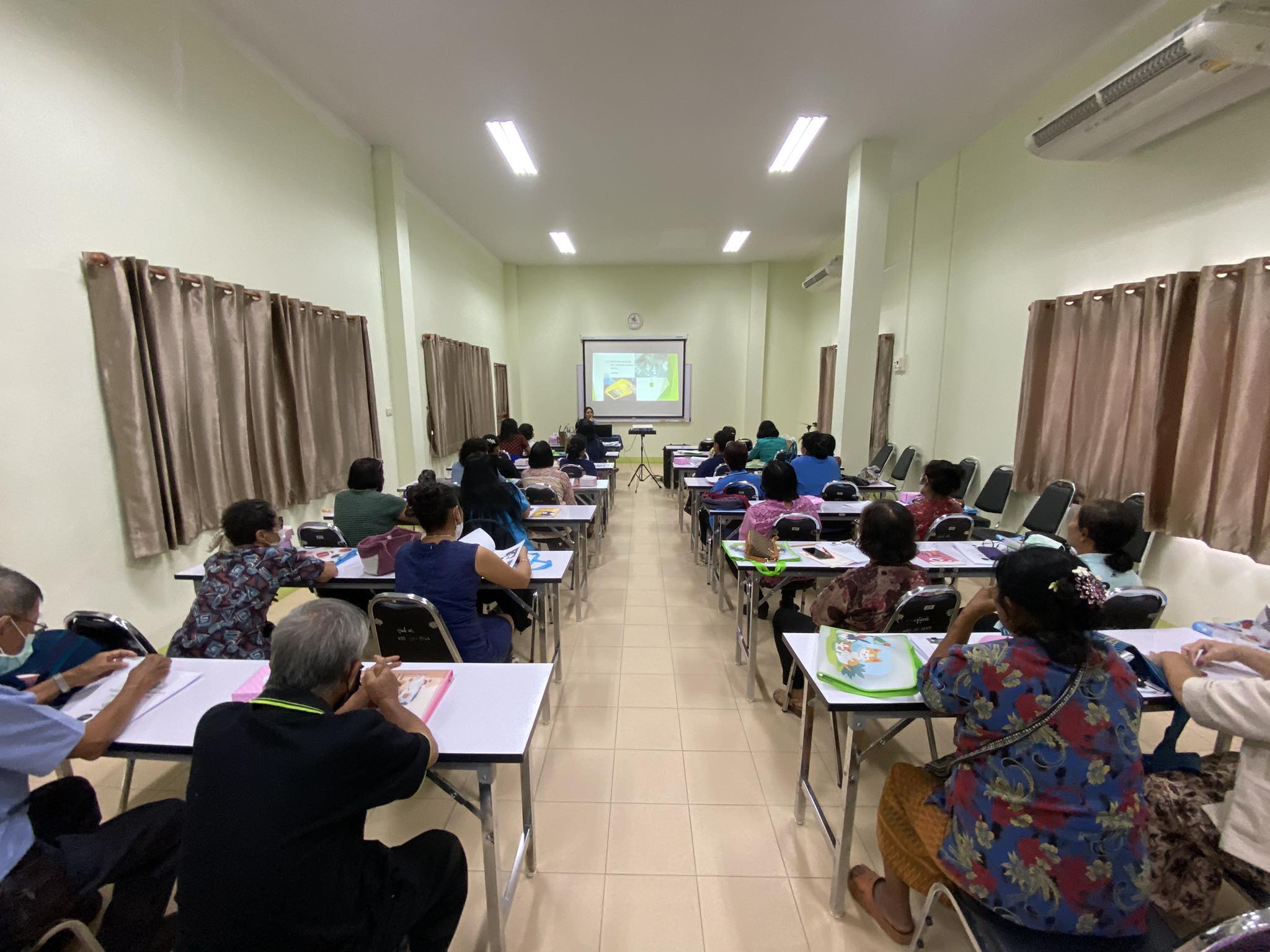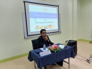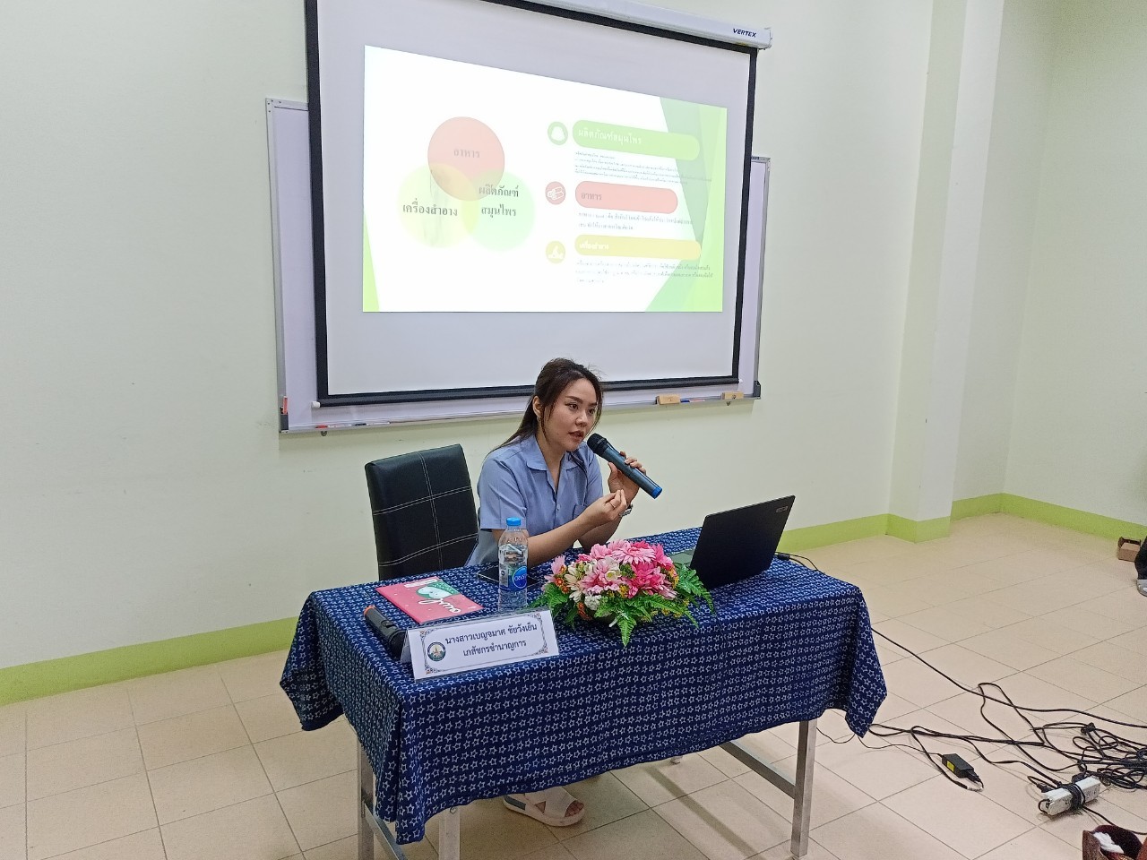 – นางสาวเบญจมาศ ชัยวังเย็น เภสัชกรชำนาญการ สำนักงานสาธารณสุขจังหวัดลำปาง บรรยายให้ความรู้เรื่อง แนวทางการขึ้นทะเบียนผลิตภัณฑ์อาหารและยา (อย.)