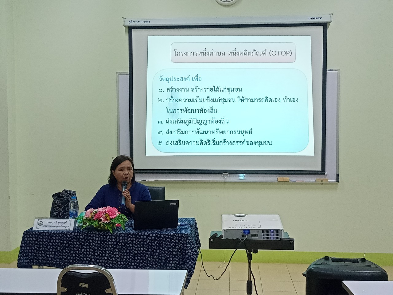 – นางสุวาณี มูลพุกก์ นักวิชาการพัฒนาชุมชนชำนาญการ สำนักงานพัฒนาชุมชนอำเภอเมืองลำปาง บรรยายให้ความรู้เรื่อง การขึ้นทะเบียนสินค้า OTOP