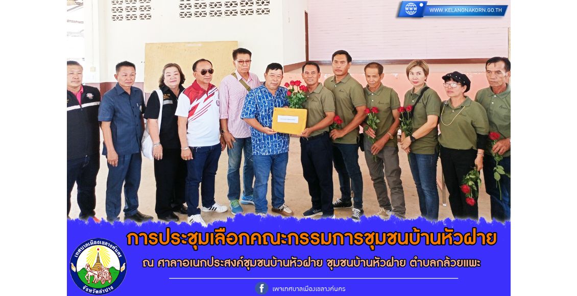เมื่อวันที่ 24 กันยายน 2566 เวลา 08.30 น. นายไพฑูรย์ โพธิ์ทอง นายกเทศมนตรีเมืองเขลางค์นคร มอบหมายให้นายบุญส่ง ทิวงศ์ษา ที่ปรึกษานายกเทศมนตรีเมืองเขลางค์นคร พร้อมด้วยพนักงานเจ้าหน้าที่กองสวัสดิการสังคม ดำเนินการประชุมเลือกคณะกรรมการชุมชนบ้านหัวฝาย หมู่ 4 ตำบลกล้วยแพะ โดยมีสมาชิกสภาเทศบาลร่วมพบปะประชาชนที่มาร่วมคัดเลือกคณะกรรมการชุมชน ณ ศาลาอเนกประสงค์ชุมชนบ้านหัวฝาย และมีผู้ได้รับคัดเลือกเป็นคณะกรรมการชุมชน จำนวน 7 คน ซึ่งคณะกรรมการชุมชนบ้านหัวฝาย ที่ได้รับการคัดเลือกจะได้มีการประชุมคัดเลือกกรรมการแต่ละตำแหน่งกันเอง โดยมีมติ ดังนี้
