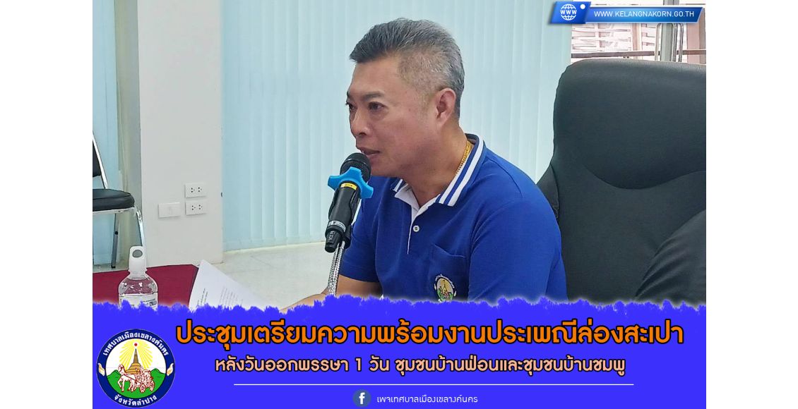วันที่ 4 ตุลาคม 2566 เวลา 09.30 น. นายไพฑูรย์ โพธิ์ทอง นายกเทศมนตรี เมืองเขลางค์นคร พร้อมด้วย คณะผู้บริหาร หัวหน้าส่วนราชการ และพนักงานเจ้าหน้าที่เทศบาลเมืองเขลางค์นคร ร่วมประชุมปรึกษาหารือกับผู้แทนสถานีตำรวจภูธรเขลางค์นคร , ประธานกรรมการชุมชนบ้านฟ่อน , ประธานกรรมการชุมชนบ้านชมพู ประธานคณะกรรมการพัฒนาสตรีตำบลชมพู , ผู้แทนโรงเรียนชุมชนบ้านฟ่อนวิทยา และภาคีเครือข่ายต่างๆ เกี่ยวกับการจัดงานโครงการจัดงานประเพณีล่องสะเปา และของดีเมืองเขลางค์นคร