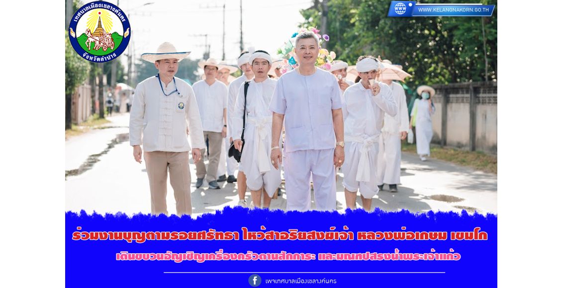 วันที่ 27 พฤศจิกายน 2565 เวลา 13.00 น. นายไพฑูรย์ โพธิ์ทอง นายกเทศมนตรีเมืองเขลางค์นคร นำคณะผู้บริหาร หัวหน้าส่วนราชการ นำพนักงาน เจ้าหน้าที่เทศบาลเมืองเขลางค์นคร และคณะกรรมการสภาวัฒนธรรมเทศบาลเมืองเขลางค์นคร คณะกรรมการพัฒนาสตรีเทศบาลเมืองเขลางค์นคร คณะกรรมการกลุ่มผู้สูงวัยเทศบาลเมืองเขลางค์นคร สมาคมไทลื้อ ตำบลกล้วยแพะ ดรงเรียนวัดหลวงวิทยา และโรงเรียนศึกษาสงเคราะห์จิตต์อารี ร่วมเดินขบวนอัญเชิญเครื่องครัวตานสักการะ หลวงพ่อเกษม เขมโก และมณฑปสรงน้ำพระเจ้าแก้ว ใน “งานบุญตามรอยศรัทธา ไหว้สาอริยสงฆ์เจ้า หลวงพ่อเกษม เขมโก” ประจำปี 25666 โดยเคลื่อนขบวนจากบริเวณเทศบาล 1 ไปยังสถานปฏิบัติธรรมหลวงพ่อเกษม เขมโก (สุสานไตรลักษณ์)