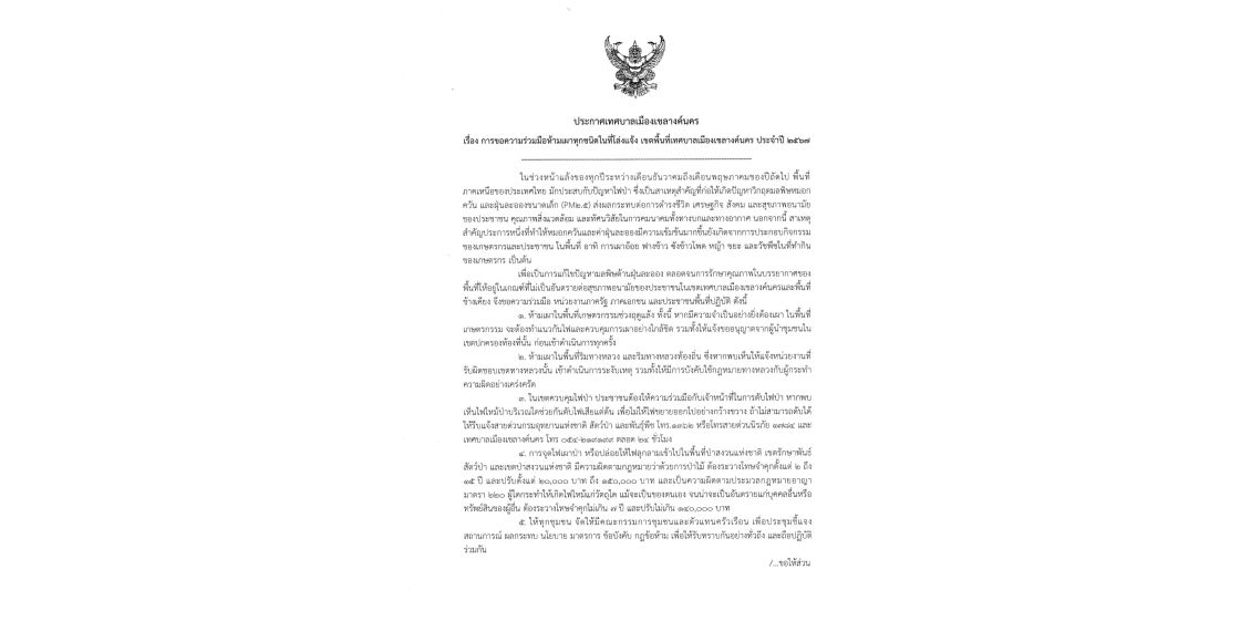 ประกาศขอความร่วมมือห้ามเผาทุกชนิดในที่โล่งแจ้ง ในเขตเทศบาลเมืองเขลางค์นคร ตามนโยบายของทางจังหวัดลำปางโดยนายชัชวาลย์ ฉายะบุตร ผู้ว่าราชการจังหวัดลำปาง ได้มอบหมายให้ นายชนาธิป เสนแย้ม รองผู้ว่าราชการจังหวัดลำปาง เป็นประธานการประชุมหารือเตรียมการแก้ไขปัญหาไฟป่าหมอกควัน ประจำปี 2567 เมื่อวันที่ 12 ธันวาคม 2566 เพื่อเตรียมความพร้อมในด้านต่างๆ ในการดำเนินการแก้ไขปัญหาไฟป่าและหมอกควันจังหวัดลำปาง ภายใต้วิสัยทัศน์ “คนลำปางร่วมใจ สร้างฟ้าใส ไร้หมอกควัน” เป้าหมายประชาชนสุขภาพดี ลดอัตราการเจ็บป่วยสาเหตุจากหมอกควัน โดยบูรณาการทุกภาคส่วนป้องกันก่อนเกิดเหตุ และระดมสรรพกำลังเพื่อเฝ้าระวัง ในการนี้ เทศบาลเมืองเขลางค์นคร ได้ตระหนักถึงความสำคัญของปัญหาและสาเหตุการเกิดไฟป่าและหมอกควัน ที่เกิดขึ้นในเขตพื้นที่ จำนวน 4 ตำบล ครอบคลุมพื้นที่ 195 ตารางกิโลเมตร มีชุมชนตั้งอยู่ในพื้นที่เสี่ยงต่อการเกิดไฟป่าสูง จำนวน 2 ตำบล คือตำบลกล้วยแพะและตำบลพระบาท จึงเห็นควรทำประกาศขอความร่วมมือห้ามเผาในที่โล่งแจ้ง เขตพื้นที่เทศบาลเมืองเขลางค์นครเพื่อเป็นการป้องกันปัญหาไฟป่าและหมอกควันที่อาจจะเกิดขึ้น Share FacebookTwitterGoogle+ReddItWhatsAppPinterestEmail