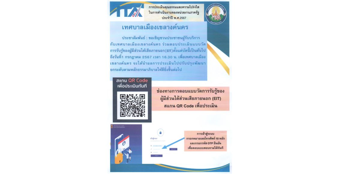 👉👉 ขอเชิญชวนประชาชนผู้รับบริการ หรือผู้มีส่วนได้ส่วนเสียภายนอก ร่วมตอบแบบวัดการรับรู้ของผู้มีส่วนได้ส่วนเสีย ภายนอก (EIT) ประจำปี 2567 ตั้งแต่บัดนี้ถึงวันที่ 1 กรกฎาคม 2567 เพื่อที่ทางเทศบาลเมืองเขลางค์นครจะได้นำผลการประเมินไปปรับปรุง พัฒนายกระดับให้ดียิ่งขึ้นไป >>>สแกน Qr Code เพื่อทำการประเมิน<<< หรือคลิ๊กที่ลิงค์👉👉👉 https://itas.nacc.go.th/go/eit/yk0h1c 🙏🙏🙏