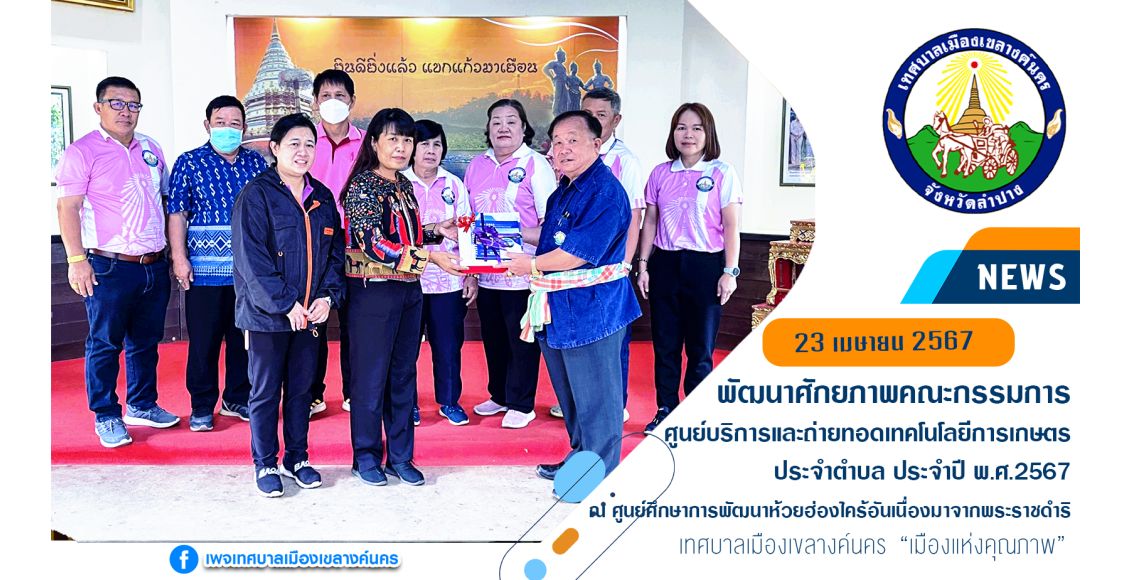 เมื่อวันที่ 23 เมษายน 2567 เวลา 09.00 น. นายไพฑูรย์ โพธิ์ทอง นายกเทศมนตรีเมืองเขลางค์นคร มอบหมายให้นายจำเนียร พรหมเพชร รองนายกเทศมนตรีเมืองเขลางค์นคร พร้อมด้วยสมาชิกสภาเทศบาลเมืองเขลางค์นคร และหัวหน้าส่วนราชการ นำคณะกรรมการศูนย์บริการและถ่ายทอดเทคโนโลยีการเกษตรประจำตำบลในเขตเทศบาลเมืองเขลางค์นคร จำนวน 63 คน เข้าร่วมการอบรมและศึกษาดูงาน ตามโครงการพัฒนาศักยภาพคณะกรรมการศูนย์บริการและถ่ายทอดเทคโนโลยีการเกษตรประจำตำบล ประจำปี พ.ศ.2567 ทั้งนี้ได้รับเกียรติจากนางสาวนิตยา ไทยใจอุ่น และนางพิมพ์ชนก ดวงพิกุล วิทยากรศูนย์พัฒนาห้วยฮ่องไคร้ กล่าวต้อนรับและแลกเปลี่ยนองค์ความรู้ด้านการเกษตร ที่เป็นประโยชน์ต่อการดำเนินงานด้านการเกษตร ณ ศูนย์ศึกษาการพัฒนาห้วยฮ่องไคร้อันเนื่องมาจากพระราชดำริ อำเภอดอยสะเก็ด จังหวัดเชียงใหม่ โดยเข้ารับฟังการบรรยายและศึกษาดูงานเกี่ยวกับการดำเนินงานของศูนย์ศึกษาการพัฒนาห้วยฮ่องไคร้อันเนื่องมาจากพระราชดำริ และเพิ่มเติมองค์ความรู้”งานศึกษาพัฒนาที่ดิน และงานศึกษาพัฒนาการปลูกพืช” อีกทั้งยังแบ่งกลุ่มแยกตามฐานการเรียนรู้ศึกษาในเรื่องต่างๆ ที่เป็นประโยชน์ต่อเกษตรกร