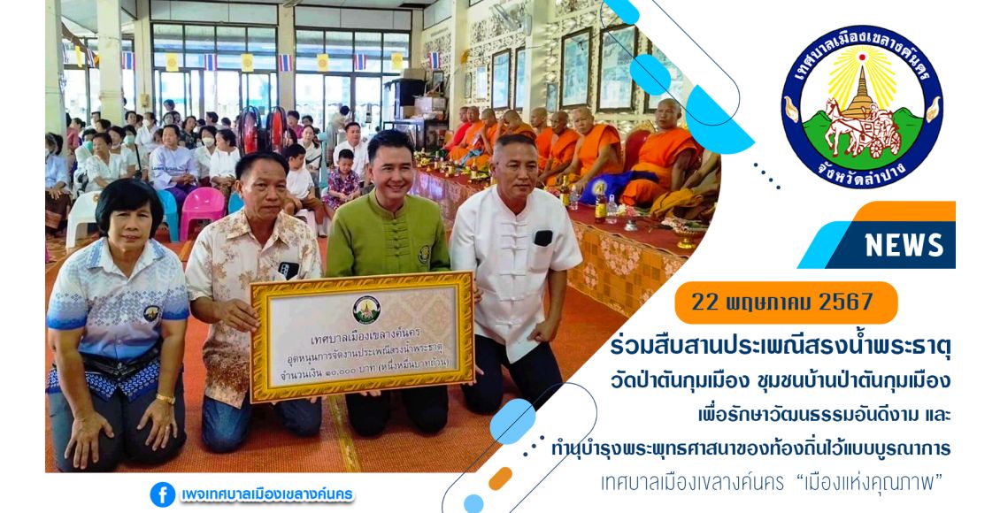 วันที่ 22 พฤษภาคม 2567 นายไพฑูรย์ โพธิ์ทอง นายกเทศมนตรีเมืองเขลางค์นคร มอบหมายให้นายนคร โยธาวงศ์ รองนายกเทศมนตรีเมืองเขลางค์นคร พร้อมด้วยสมาชิกสภาเทศบาล ร่วมโครงการจัดงานประเพณีสรงน้ำพระธาตุวัดป่าตันกุมเมือง ชุมชนบ้านป่าตันกุมเมือง ตำบลปงแสนทอง อำเภอเมืองลำปาง จังหวัดลำปาง เพื่อเป็นการอนุรักษ์ ส่งเสริม และถ่ายทอดขนบธรรมเนียมประเพณีที่ดีงามของท้องถิ่น สร้างความรัก ความสามัคคีในหมู่คณะ ให้แก่เด็ก เยาวชนและประชาชนได้รับทราบ ตลอดจนเป็นการปลูกฝังให้ประชาชนได้มีส่วนร่วมในการรักษาวัฒนธรรมอันดีงาม และทำนุบำรุงพระพุทธศาสนาของท้องถิ่นไว้แบบบูรณาการ