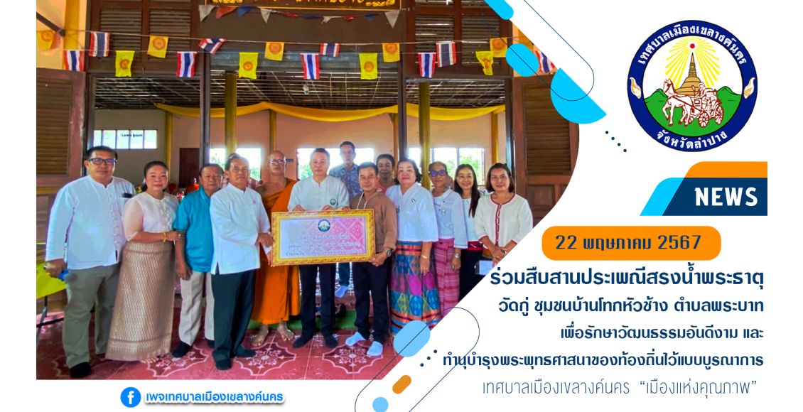 วันที่ 22 พฤษภาคม 2567 นายไพฑูรย์ โพธิ์ทอง นายกเทศมนตรีเมืองเขลางค์นคร มอบหมายให้นายธาราเงิน จันทร์คำ รองนายกเทศมนตรีเมืองเขลางค์นคร พร้อมด้วยสมาชิกสภาเทศบาล ร่วมโครงการจัดงานประเพณีสรงน้ำพระธาตุวัดกู่ ชุมชนบ้านโทกหัวช้าง ตำบลพระบาท อำเภอเมืองลำปาง จังหวัดลำปาง เพื่อเป็นการอนุรักษ์ ส่งเสริม และถ่ายทอดขนบธรรมเนียมประเพณีที่ดีงามของท้องถิ่น สร้างความรัก ความสามัคคีในหมู่คณะ ให้แก่เด็ก เยาวชนและประชาชนได้รับทราบ ตลอดจนเป็นการปลูกฝังให้ประชาชนได้มีส่วนร่วมในการรักษาวัฒนธรรมอันดีงาม และทำนุบำรุงพระพุทธศาสนาของท้องถิ่นไว้แบบบูรณาการ