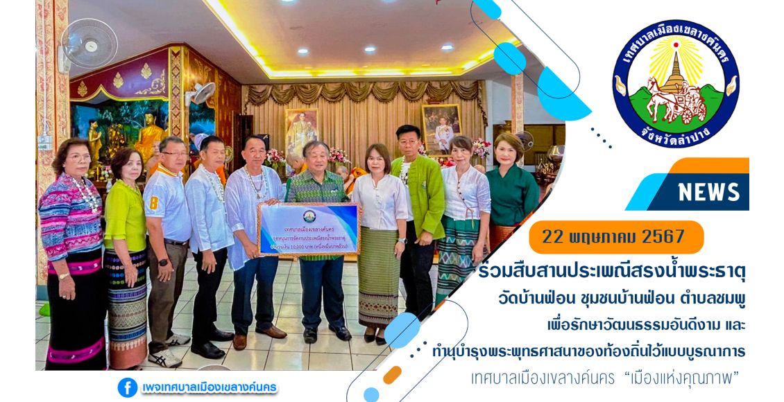 วันที่ 22 พฤษภาคม 2567 นายไพฑูรย์ โพธิ์ทอง นายกเทศมนตรีเมืองเขลางค์นคร มอบหมายให้นายจำเนียร พรหมเพชร รองนายกเทศมนตรีเมืองเขลางค์นคร พร้อมด้วยสมาชิกสภาเทศบาล และหัวหน้าส่วนราชการ ร่วมโครงการจัดงานประเพณีสรงน้ำพระธาตุวัดบ้านฟ่อน ชุมชนบ้านฟ่อน ตำบลชมพู อำเภอเมืองลำปาง จังหวัดลำปาง เพื่อเป็นการอนุรักษ์ ส่งเสริม และถ่ายทอดขนบธรรมเนียมประเพณีที่ดีงามของท้องถิ่น สร้างความรัก ความสามัคคีในหมู่คณะ ให้แก่เด็ก เยาวชนและประชาชนได้รับทราบ ตลอดจนเป็นการปลูกฝังให้ประชาชนได้มีส่วนร่วมในการรักษาวัฒนธรรมอันดีงาม และทำนุบำรุงพระพุทธศาสนาของท้องถิ่นไว้แบบบูรณาการ