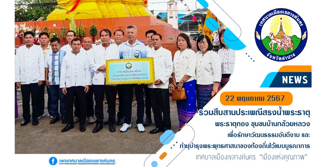 วันที่ 22 พฤษภาคม 2567 นายไพฑูรย์ โพธิ์ทอง นายกเทศมนตรีเมืองเขลางค์นคร พร้อมด้วยสมาชิกสภาเทศบาล ร่วมโครงการจัดงานประเพณีสรงน้ำพระธาตุพระธาตุทอง ชุมชนบ้านกล้วยหลวง ตำบลกล้วยแพะ อำเภอเมืองลำปาง จังหวัดลำปาง เพื่อเป็นการอนุรักษ์ ส่งเสริม และถ่ายทอดขนบธรรมเนียมประเพณีที่ดีงามของท้องถิ่น สร้างความรัก ความสามัคคีในหมู่คณะ ให้แก่เด็ก เยาวชนและประชาชนได้รับทราบ ตลอดจนเป็นการปลูกฝังให้ประชาชนได้มีส่วนร่วมในการรักษาวัฒนธรรมอันดีงาม และทำนุบำรุงพระพุทธศาสนาของท้องถิ่นไว้แบบบูรณาการ