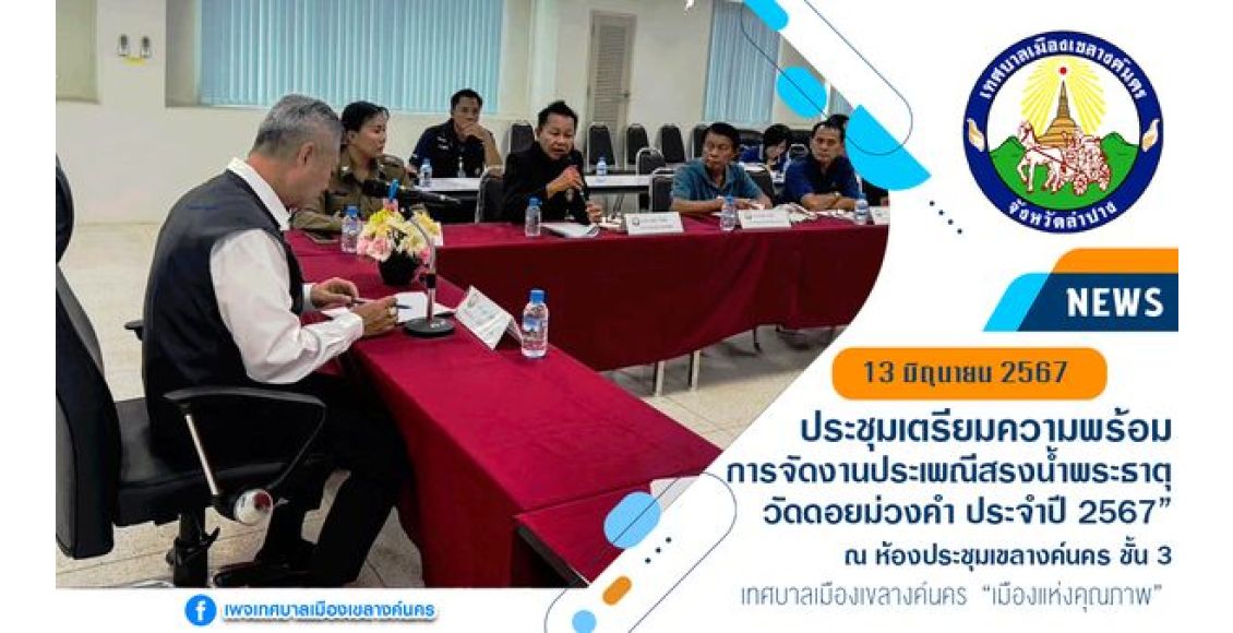 วันที่ 13 มิถุนายน 2567 เวลา 10.00 น. ณ ห้องประชุมเขลางค์นคร ชั้น 3 นายไพฑูรย์ โพธิ์ทอง นายกเทศมนตรีเมืองเขลางค์นคร พร้อมด้วย คณะผู้บริหาร สมาชิกสภาเทศบาล รองปลัดเทศบาลเมืองเขลางค์นคร และเจ้าหน้าที่ ร่วมประชุมปรึกษาหารือกับ พ.ต.ต.หญิง นภสร งามภักดีโสภา สวป.(ชส.) สภ.เขลางค์นคร , รร.วัดหลวงวิทยา , ประธานคณะกรรมการสตรีฯ,ประธานอาสมัครสาธารณสุขฯ , ประธานชุมชนในเขตตำบลกล้วยแพะ และภาคีเครือข่ายต่างๆ เกี่ยวกับการจัดงานโครงการจัดกิจกรรมงานสรงน้ำพระธาตุดอยม่วงคำ ประจำปี พ.ศ. 2567 โดยมีวัตถุประสงค์เพื่ออนุรักษ์และส่งเสริมประเพณีวัฒนธรรมอันดีงามของท้องถิ่นไว้ สร้างความรักความสามัคคีชุมชน ตลอดจนเป็นการปลูกฝังให้ประชาชนได้มีส่วนร่วมในการรักษาวัฒนธรรมอันดีงามของท้องถิ่นประชาชนได้ทำกิจกรรมร่วมกันเกิดความสนุกสนานรื่นเริง และประชาสัมพันธ์ประเพณี วัฒนธรรม รวมทั้งภูมิปัญญาท้องถิ่นของเทศบาลเมืองเขลางค์นคร ซึ่งได้กำหนดจัดงานประเพณีสรงน้ำพระธาตุวัดดอยม่วงคำ ประจำปี 2567 ในวันเสาร์ที่ 29 มิถุนายน 2567 ณ วัดดอยม่วงคำ ต.กล้วยแพะ อ.เมือง จ.ลำปาง