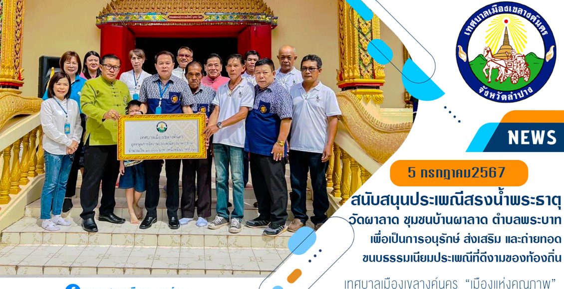 วันที่ 5 กรกฎาคม 2567 นายไพฑูรย์ โพธิ์ทอง นายกเทศมนตรีเมืองเขลางค์นคร มอบหมายให้นายธาราเงิน จันทร์คำ รองนายกเทศมนตรีเมืองเขลางค์นคร ร่วมโครงการจัดงานประเพณีสรงน้ำพระธาตุวัดผาลาด ชุมชนบ้านผาลาด ตำบลพระบาท อำเภอเมืองลำปาง จังหวัดลำปาง เพื่อเป็นการอนุรักษ์ ส่งเสริม และถ่ายทอดขนบธรรมเนียมประเพณีที่ดีงามของท้องถิ่น สร้างความรัก ความสามัคคีในหมู่คณะ ให้แก่เด็ก เยาวชนและประชาชนได้รับทราบ ตลอดจนเป็นการปลูกฝังให้ประชาชนได้มีส่วนร่วมในการรักษาวัฒนธรรมอันดีงามและทำนุบำรุงพระพุทธศาสนาของท้องถิ่นไว้แบบบูรณาการ
