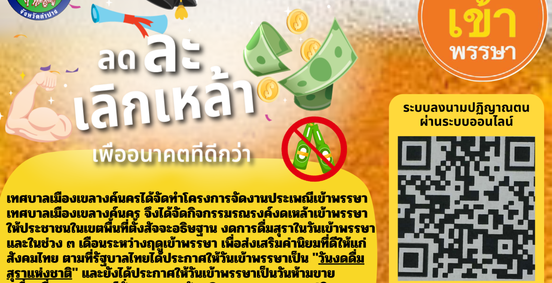 4) จัดกิจกรรมรณรงค์งดเหล้าเข้าพรรษาให้ประชาชนในเขตพื้นที่ตั้งสัจจะอธิษฐาน งดการดื่มสุราในวันเข้าพรรษาและในช่วง ๓ เดือนระหว่างฤดูเข้าพรรษา เพื่อส่งเสริมค่านิยมที่ดีให้แก่สังคมไทย ตามที่รัฐบาลไทยได้ประกาศให้วันเข้าพรรษาเป็น “วันงดดื่มสุราแห่งชาติ” และยังได้ประกาศให้วันเข้าพรรษาเป็นวันห้ามขายเครื่องดื่มแอลกอฮอล์ทั่วราชอาณาจักร ผ่านทางสื่อออนไลน์และลงชื่อในสมุดลงนามงดเหล้าเข้าพรรษา