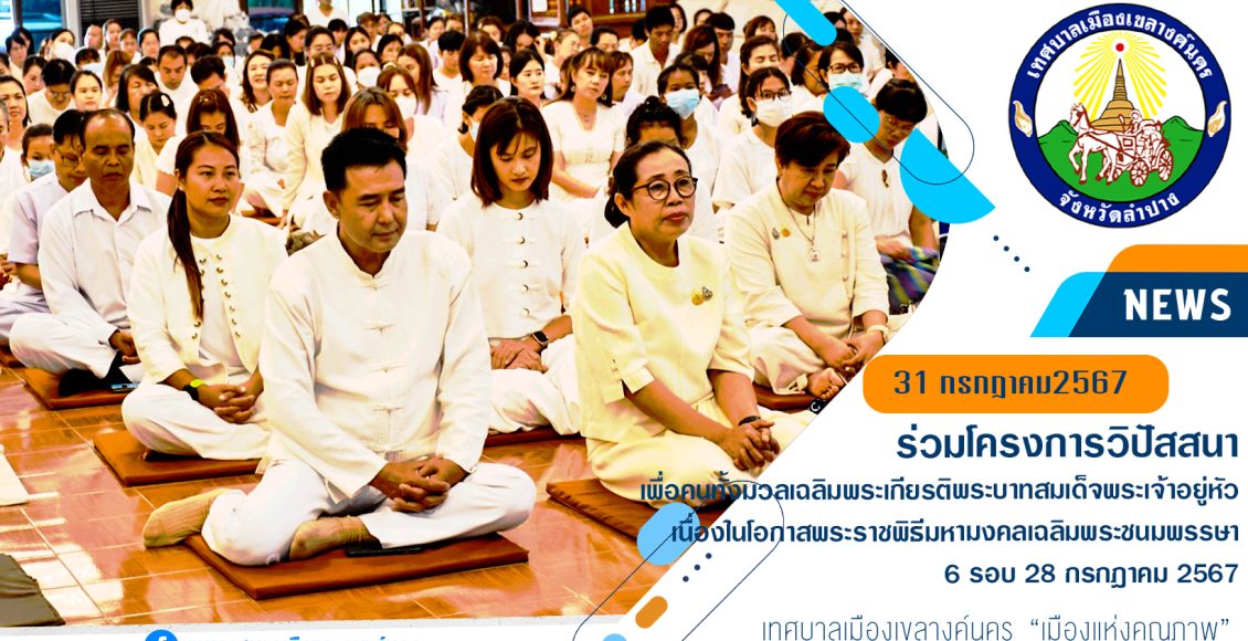 วันที่ 31 กรกฎาคม 2567 เวลา 13.00 น.นายไพฑูรย์ โพธิ์ทอง นายกเทศมนตรีเมืองเขลางค์นคร มอบหมายให้นายนคร โยธาวงศ์ รองนายกเทศมนตรีเมืองเขลางค์นคร พร้อมด้วยหัวหน้าส่วนราชการ ร่วมโครงการวิปัสสนาเพื่อคนทั้งมวล เฉลิมพระเกียรติพระบาทสมเด็จพระเจ้าอยู่หัว เนื่องในโอกาสพระราชพิธีมหามงคลเฉลิมพระชนมพรรษา 6 รอบ 28 กรกฎาคม 2567 โดยมีนายชัชวาลย์ ฉายะบุตร ผู้ว่าราชการจังหวัดลำปาง เป็นประธานในพิธี ณ วัดสามัคคีบุญญาราม ต.พระบาท อ.เมืองลำปาง