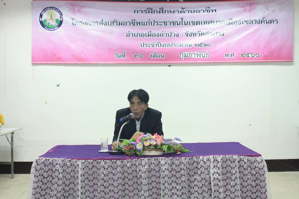 เมื่่อวันที่ 24 กุมภาพันธ์ 2560 เวลา 09.00 น. นายไพฑูรย์ โพธิ์ทอง นายกเทศมนตรีเมืองเขลางค์นคร มอบหมายให้นายบุญเรือน เครือวิยะ เลขานุการนายกเทศมนตรีเมืองเขลางค์นคร เป็นประธานในพิธีเปิดการฝึกอบรมการนวดไทยเบื้องต้น ตามโครงการส่งเสริมอาชีพแก่ประชาชนในเขตเทศบาลเมืองเขลางค์นคร ประจำปี 2560 โดยมีสมาชิกสภาเทศบาล และหัวหน้าส่วนราชการร่วมเป็นเกียรติในพิธีเปิด ณ ห้องประชุมเทศบาลเมืองเขลางค์นคร (โรงเรียนบ้านดอนตันเดิม) และได้รับความอนุเคราะห์วิทยากร คือ นางสาวจิตตานันท์ อ้นด้วง ผู้สาธิตและฝึกปฏิบัติการนวดไทยเบื้องต้น จำนวน 20 คน เพื่อ ให้สามารถนำไปประกอบอาชีพหลักและอาชีพเสริม สร้างรายได้ให้ตนเองและครอบครัวต่อไป