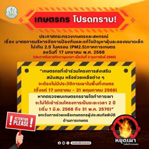 วันที่ 14 มีนาคม 2568 นางสาวนุชจิรา คิดอ่าน นักวิชาการเกษตรปฏิบัติการ เผยแพร่ประชาสัมพันธ์แจ้งเรื่อง มาตรการบริหารจัดการป้องกันและแก้ไขปัญหาฝุ่นละอองขนาดเล็กไม่เกิน 2.5 ไมครอน