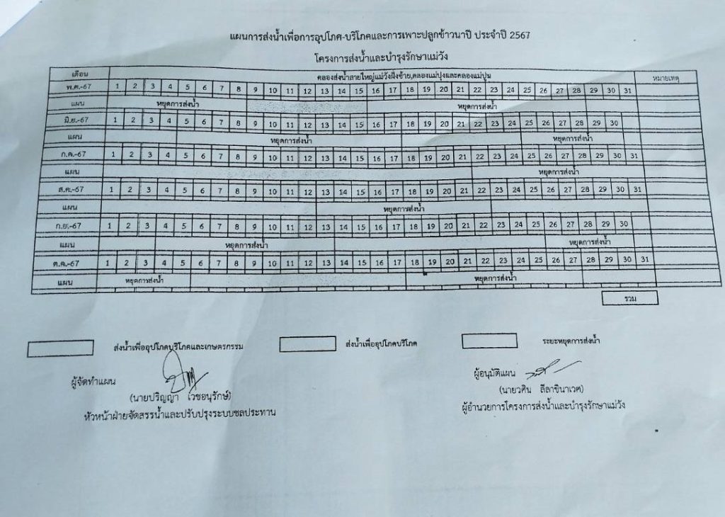วันที่ 11 กรกฎาคม 2567 นายสมาน ใจเย็น ประธานศูนย์บริการเเละถ่ายทอดเทคโนโลยีการเกษตรประจำตำบลปงเเสนทอง แจ้งแผนการส่งน้ำเพื่ออุปโภค – บริโภคเเละการเพาะปลูกข้าวนาปี ประจำปี 2567 ของคลองส่งน้ำแม่วังสายใหญ่ฝั่งซ้ายเเละคลองส่งน้ำสายใหญ่เเม่ปุง